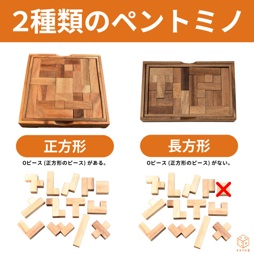 通常の12ピースが入った「ペントミノ長方形」、正方形のピースが加わった13ピースの「ペントミノ正方形」がございます。
