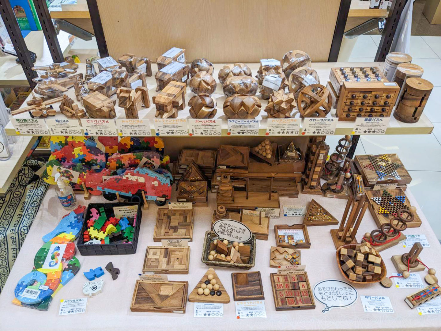 木製パズル・ゲームコーナーは写真の通りでたくさんの商品を扱っています!