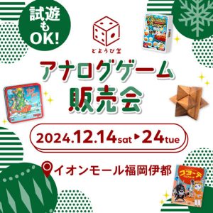 毎日寒くなってあったかインナーが手放せない担当Aです。皆さん、元気にお過ごしでしょうか? 今回はイオンモール福岡伊都さんで単独イベントの開催です! 年末年始、家族や友人と集まる機会も増える時期に、ボードゲームや木製のゲー […]