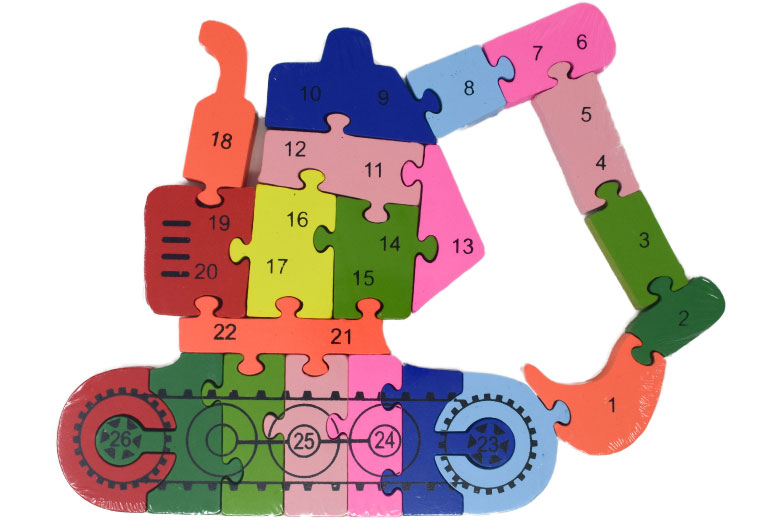 はたらく車といえばショベルカー!両面にアルファベットと数字が描かれた26ピース。模様がつながるように解いてみよう。