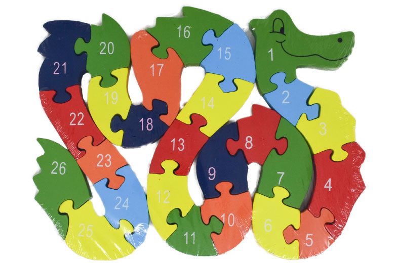 デコボコしたワニさんのパズル。両面にアルファベットと数字が描かれた26ピース。細長いピースを並べるのが楽しいです。