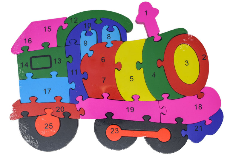 出発進行!汽車のパズル。両面にアルファベットと数字が描かれた26ピース。車輪や煙突周りから組むとわかりやすいかも。