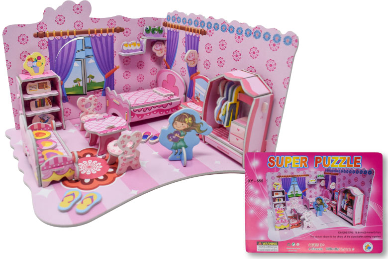 ピンク色の女の子のお部屋。家具や洋服、女の子のパーツも付いていて、動かして遊べるのが楽しい!